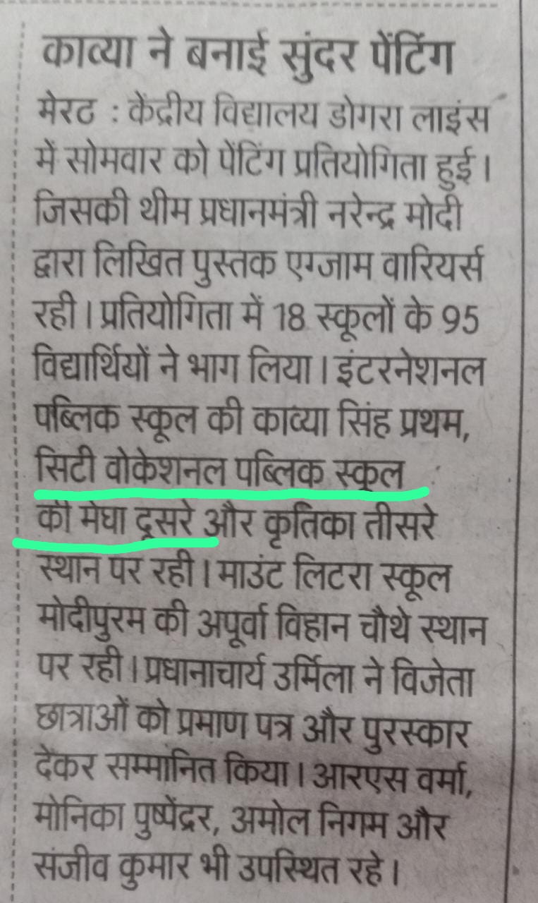 With reference to the 6th edition of Pariksha Pe Charcha, an On the Spot Painting Competition was organized by Kendriya Vidyalaya Dogra Lines, Meerut. Around 100 students from different schools of Meerut participated with great zeal and zest in the competition and divulged their artistic skills. The theme was the Mantras suggested by PM Modi to reduce exam stress and become exam warrior. Megha and Kritika from CVPS partook in the competition and brought laurels to school by bagging 2nd and 3rd prize respectively.
